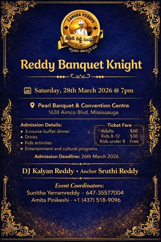 Canada Reddy’s is delighted to extend a warm invitation to all Reddy Families for our much-anticipated Annual Reddy Banquet Knight. This special evening will take place on Saturday, 28th of March 2026, at the elegant Pearl Banquet & Convention Centre located at 1638 Aimco Blvd. in Mississauga.